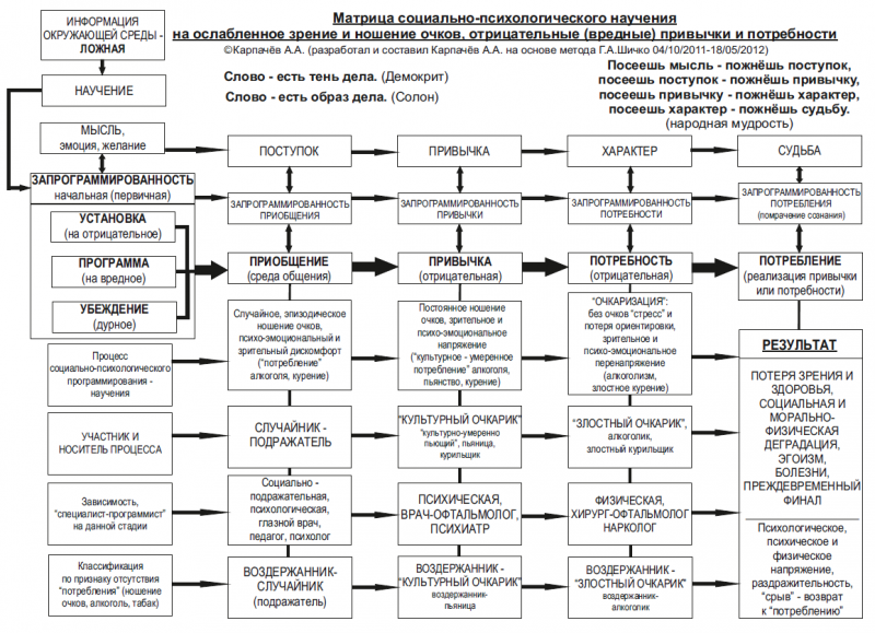 Дальнейшая разработка данного подхода привела к матричному представлению элементов и связей между ними в реальной жизни общества, отображающих процесс как положительного, так и отрицательного, социально-психологического программирования и научения. На рис. 2 приведено матричное представление формирования привычек и потребностей в процессе ослабления зрения, самоотравления алкогольным ядом («употребления алкоголя»), самоотравления ядовитым табачным дымом («курения»).